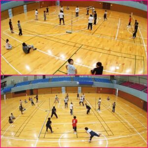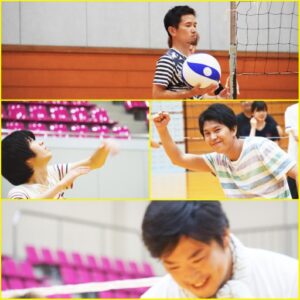 まず始めは、みんなでソフトバレーのネットを張りました。(写真右上)