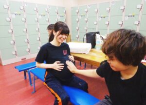 “妊婦さんごっこ”。N譲(右)がI嬢(左)に巻き込まれるの図ww
