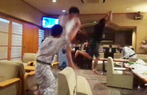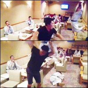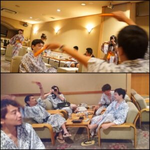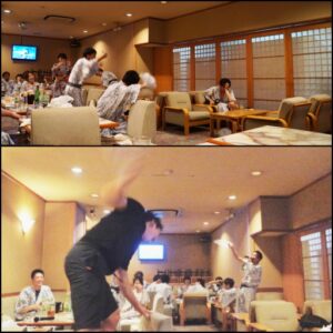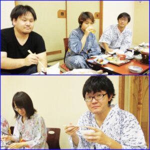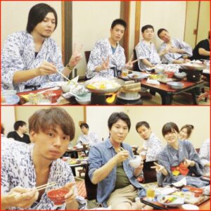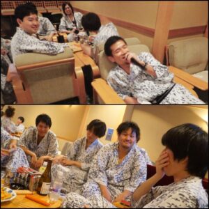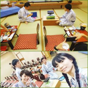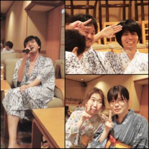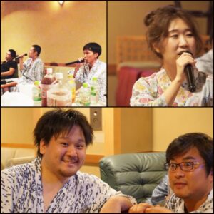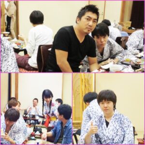 下:旅館のお部屋が同じ4人組。宴会の時は温泉に入れずだったようで私服でしたが、